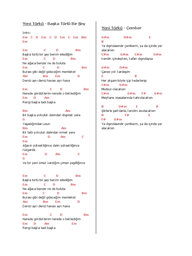 F C G C F Oynaşır mıyım bi daha C Kadın mı kız mı bi daha F Ben ettim sen etme affet C Bırakma beni bu karda kışta F Bitti Geçti gitti tövbe Tövbe tövbe tövbe tövbe E tövbe e tövbe F Dolaşır mıyım bi daha C O bar bu bar geceden sabaha F Hadi kapat beni evlere at C Dönersem eğer koy kapıya x2 F C Kalk gidelim ele oh dedirtme F C Sevdiğini kurda. Levent Yüksel - Ya Sonra. Tarkan - Ölürüm Sana.